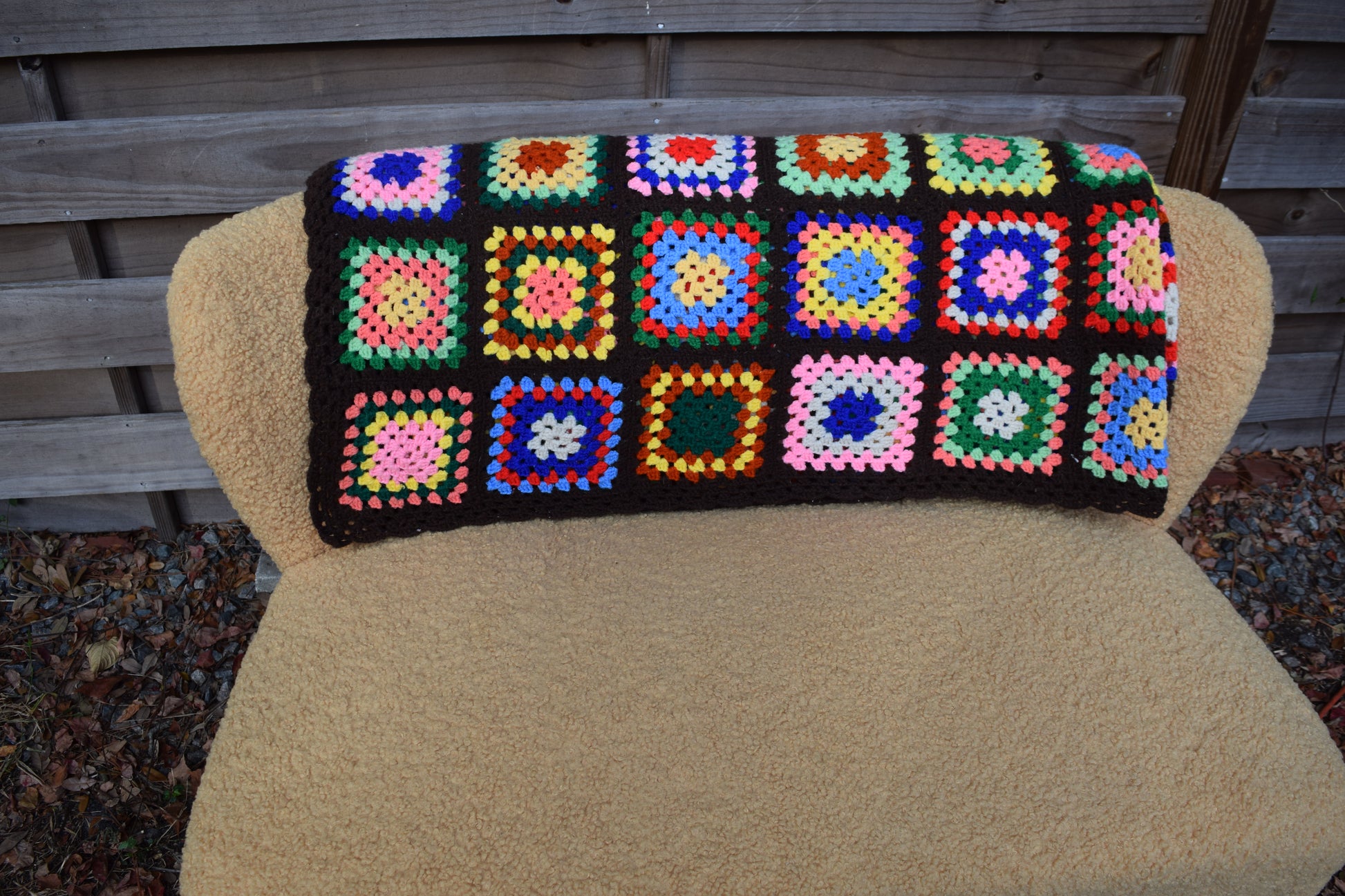 Made to look like the popular granny square design, this blanket features bright colorful, almost floral, design on a brown base.