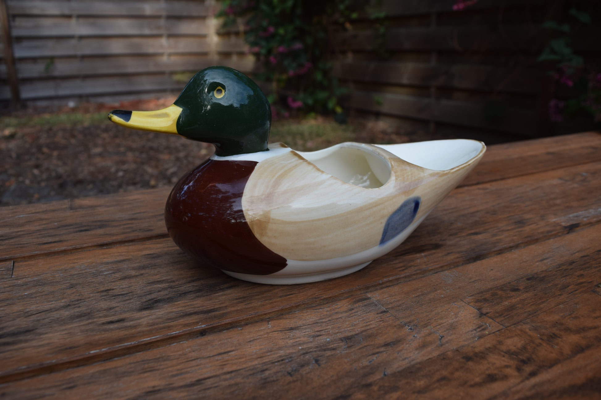 This mallard-style trinket dish includes a larger bowl like cavity and a smaller top area that could hold rings or change. This cute ceramic friend could be used in a variety of ways throughout the house!