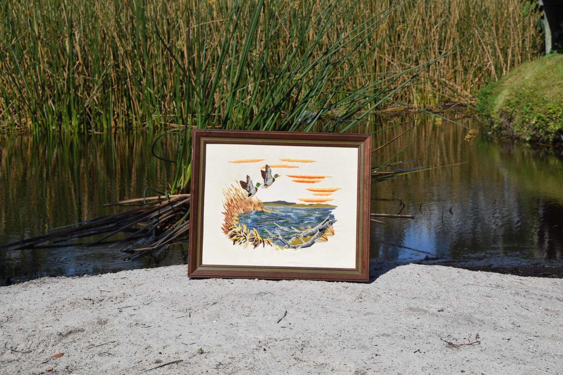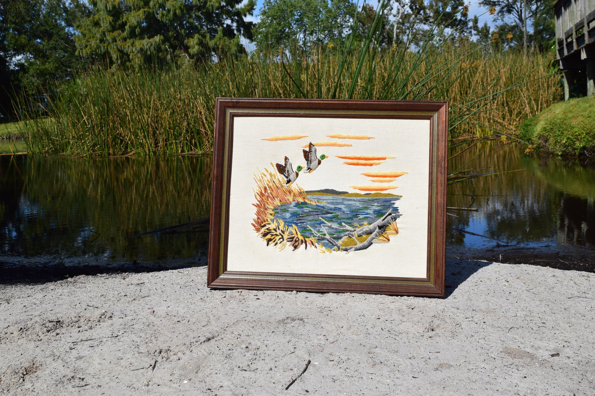 This embroidery piece titles "Mallards in the Wind" was a design created by Andree Palmateer for Sunset Stitchery in the 1970's. Originally sold as a kit, this piece is now finished and beautifully framed.